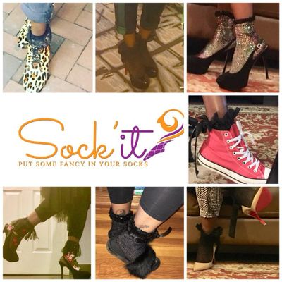 Fishnet ankle/slouch sock paired with feathers or faux rhinestones. Rhinestones come in rose , red, purple, clear and black.